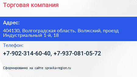 Торговая компания по адресу 404130, Волгоградская область, Волжский, проезд Индустриальный 1-й, 18 в дальнейшем Организация, размещена в следующих категориях: