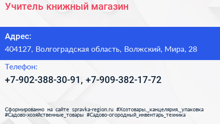 Учитель, книжный магазин по адресу 404127, Волгоградская область, Волжский, Мира, 28 в дальнейшем Организация, размещена в следующих категориях: