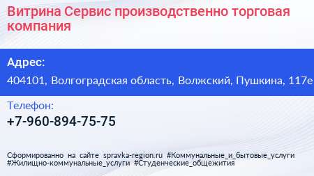 Витрина-Сервис, производственно-торговая компания по адресу 404101, Волгоградская область, Волжский, Пушкина, 117е в дальнейшем Организация, размещена в следующих категориях: