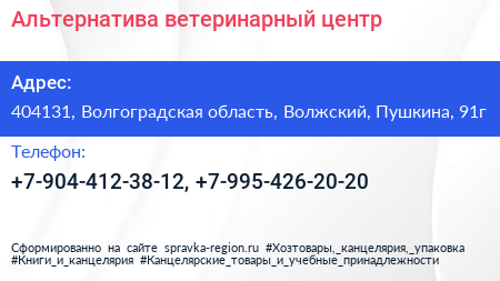 Альтернатива, ветеринарный центр по адресу 404131, Волгоградская область, Волжский, Пушкина, 91г в дальнейшем Организация, размещена в следующих категориях:
