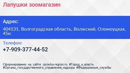 Лапушки, зоомагазин по адресу 404131, Волгоградская область, Волжский, Оломоуцкая, 45и в дальнейшем Организация, размещена в следующих категориях: