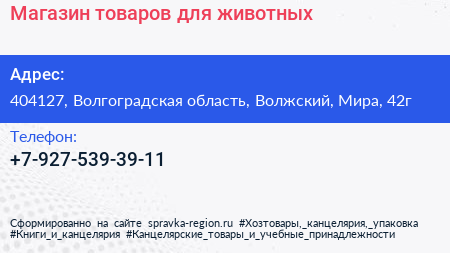 Магазин товаров для животных по адресу 404127, Волгоградская область, Волжский, Мира, 42г в дальнейшем Организация, размещена в следующих категориях: