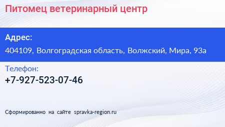 Питомец, ветеринарный центр по адресу 404109, Волгоградская область, Волжский, Мира, 93а в дальнейшем Организация, размещена в следующих категориях: