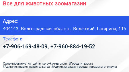 Все для животных, зоомагазин по адресу 404143, Волгоградская область, Волжский, Гагарина, 115 в дальнейшем Организация, размещена в следующих категориях: