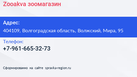 Zooakva, зоомагазин по адресу 404109, Волгоградская область, Волжский, Мира, 95 в дальнейшем Организация, размещена в следующих категориях: