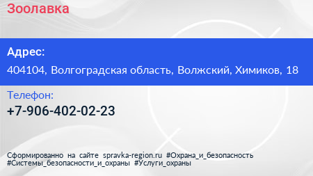 Зоолавка по адресу 404104, Волгоградская область, Волжский, Химиков, 18 в дальнейшем Организация, размещена в следующих категориях: