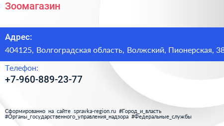 Зоомагазин по адресу 404125, Волгоградская область, Волжский, Пионерская, 38 в дальнейшем Организация, размещена в следующих категориях: