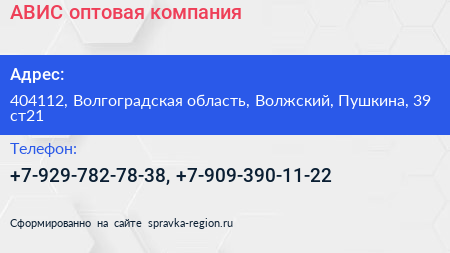 АВИС, оптовая компания по адресу 404112, Волгоградская область, Волжский, Пушкина, 39 ст21 в дальнейшем Организация, размещена в следующих категориях: