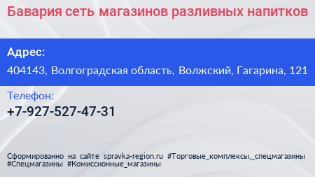 Бавария, сеть магазинов разливных напитков по адресу 404143, Волгоградская область, Волжский, Гагарина, 121 в дальнейшем Организация, размещена в следующих категориях: