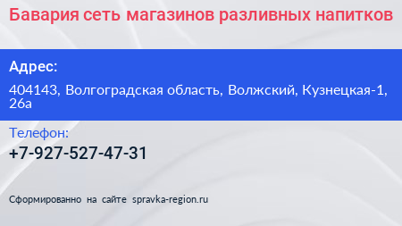 Бавария, сеть магазинов разливных напитков по адресу 404143, Волгоградская область, Волжский, Кузнецкая-1, 26а в дальнейшем Организация, размещена в следующих категориях: