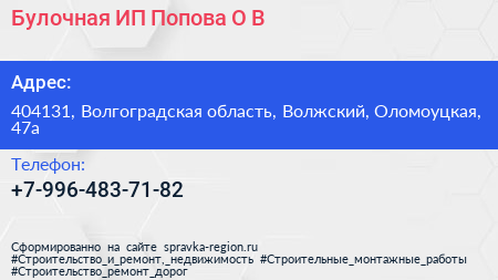 Булочная, ИП Попова О.В. по адресу 404131, Волгоградская область, Волжский, Оломоуцкая, 47а в дальнейшем Организация, размещена в следующих категориях: