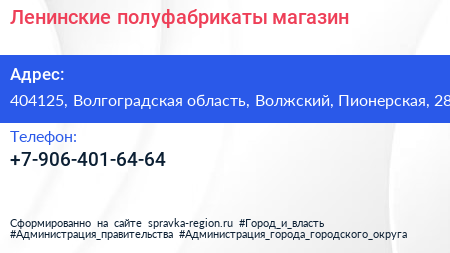Ленинские полуфабрикаты, магазин по адресу 404125, Волгоградская область, Волжский, Пионерская, 28 в дальнейшем Организация, размещена в следующих категориях: