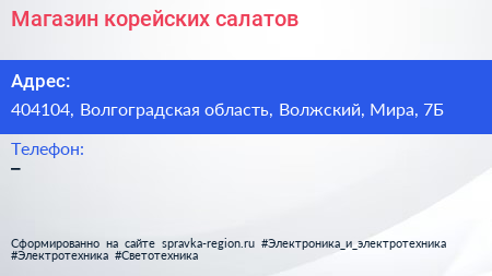 Магазин корейских салатов по адресу 404104, Волгоградская область, Волжский, Мира, 7Б в дальнейшем Организация, размещена в следующих категориях: