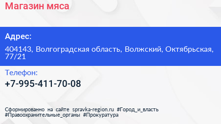 Магазин мяса по адресу 404143, Волгоградская область, Волжский, Октябрьская, 77/21 в дальнейшем Организация, размещена в следующих категориях: