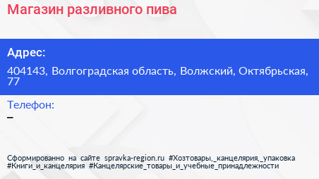 Магазин разливного пива по адресу 404143, Волгоградская область, Волжский, Октябрьская, 77 в дальнейшем Организация, размещена в следующих категориях: