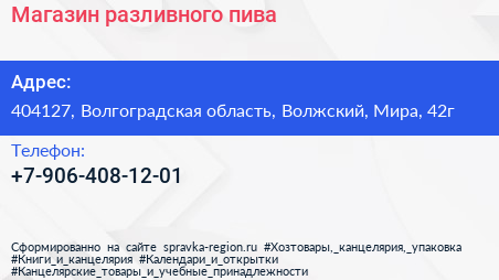 Магазин разливного пива по адресу 404127, Волгоградская область, Волжский, Мира, 42г в дальнейшем Организация, размещена в следующих категориях: