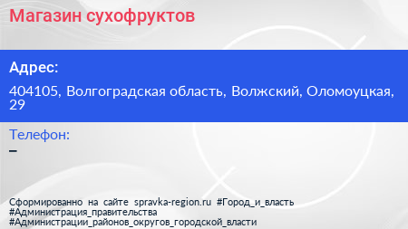 Магазин сухофруктов по адресу 404105, Волгоградская область, Волжский, Оломоуцкая, 29 в дальнейшем Организация, размещена в следующих категориях:
