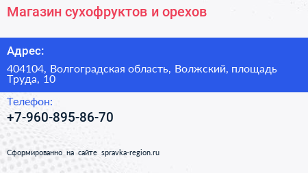 Магазин сухофруктов и орехов по адресу 404104, Волгоградская область, Волжский, площадь Труда, 10 в дальнейшем Организация, размещена в следующих категориях: