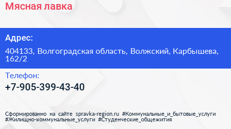 Мясная лавка по адресу 404133, Волгоградская область, Волжский, Карбышева, 162/2 в дальнейшем Организация, размещена в следующих категориях: