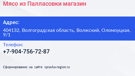 Мясо из Палласовки, магазин по адресу 404132, Волгоградская область, Волжский, Оломоуцкая, 9/1 в дальнейшем Организация, размещена в следующих категориях: