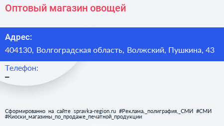 Оптовый магазин овощей по адресу 404130, Волгоградская область, Волжский, Пушкина, 43 в дальнейшем Организация, размещена в следующих категориях: