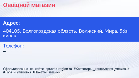 Овощной магазин по адресу 404105, Волгоградская область, Волжский, Мира, 56а киоск в дальнейшем Организация, размещена в следующих категориях:
