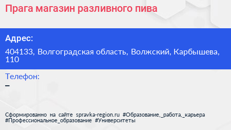 Прага, магазин разливного пива по адресу 404133, Волгоградская область, Волжский, Карбышева, 110 в дальнейшем Организация, размещена в следующих категориях: