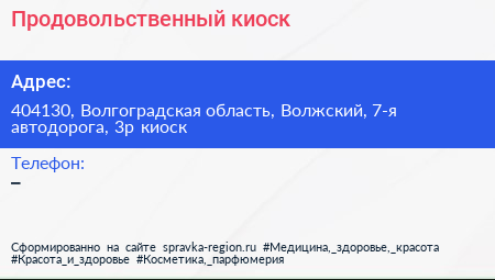 Продовольственный киоск по адресу 404130, Волгоградская область, Волжский, 7-я автодорога, 3р киоск в дальнейшем Организация, размещена в следующих категориях:
