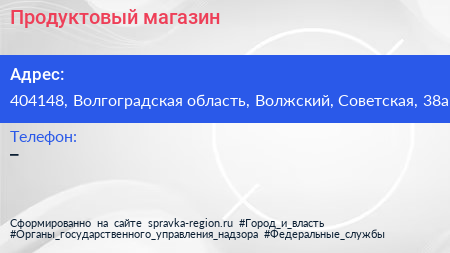Продуктовый магазин по адресу 404148, Волгоградская область, Волжский, Советская, 38а в дальнейшем Организация, размещена в следующих категориях: