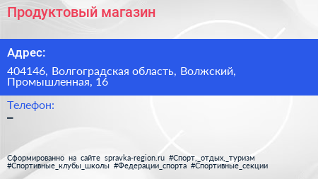 Продуктовый магазин по адресу 404146, Волгоградская область, Волжский, Промышленная, 16 в дальнейшем Организация, размещена в следующих категориях: