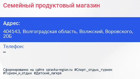 Семейный, продуктовый магазин по адресу 404143, Волгоградская область, Волжский, Воровского, 20Б в дальнейшем Организация, размещена в следующих категориях: