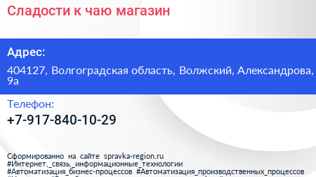 Сладости к чаю, магазин по адресу 404127, Волгоградская область, Волжский, Александрова, 9а в дальнейшем Организация, размещена в следующих категориях: