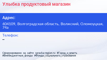 Улыбка, продуктовый магазин по адресу 404109, Волгоградская область, Волжский, Оломоуцкая, 74а в дальнейшем Организация, размещена в следующих категориях: