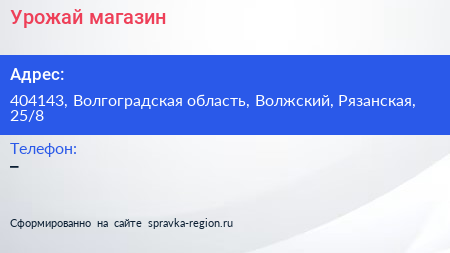 Урожай, магазин по адресу 404143, Волгоградская область, Волжский, Рязанская, 25/8 в дальнейшем Организация, размещена в следующих категориях: