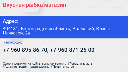 Вкусная рыбка, магазин по адресу 404131, Волгоградская область, Волжский, Клавы Нечаевой, 2а в дальнейшем Организация, размещена в следующих категориях: