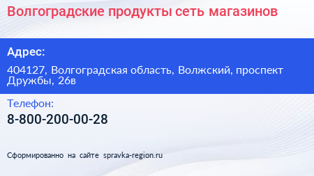 Волгоградские продукты, сеть магазинов по адресу 404127, Волгоградская область, Волжский, проспект Дружбы, 26в в дальнейшем Организация, размещена в следующих категориях:
