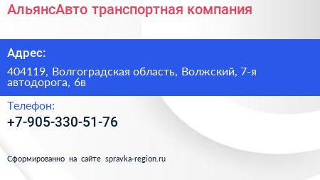 АльянсАвто, транспортная компания по адресу 404119, Волгоградская область, Волжский, 7-я автодорога, 6в в дальнейшем Организация, размещена в следующих категориях: