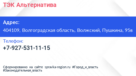 ТЭК Альтернатива по адресу 404109, Волгоградская область, Волжский, Пушкина, 95в в дальнейшем Организация, размещена в следующих категориях:
