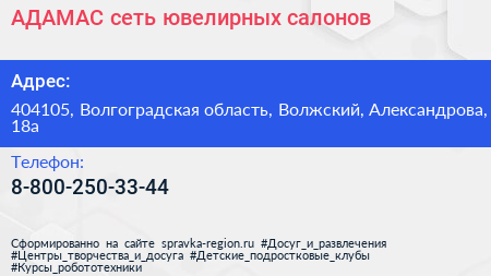 АДАМАС, сеть ювелирных салонов по адресу 404105, Волгоградская область, Волжский, Александрова, 18а в дальнейшем Организация, размещена в следующих категориях: