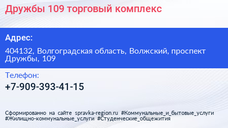 Дружбы 109, торговый комплекс по адресу 404132, Волгоградская область, Волжский, проспект Дружбы, 109 в дальнейшем Организация, размещена в следующих категориях: