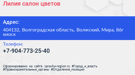 Лилия, салон цветов по адресу 404132, Волгоградская область, Волжский, Мира, 86г киоск в дальнейшем Организация, размещена в следующих категориях: