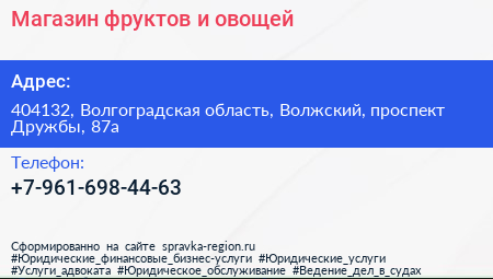 Магазин фруктов и овощей по адресу 404132, Волгоградская область, Волжский, проспект Дружбы, 87а в дальнейшем Организация, размещена в следующих категориях: