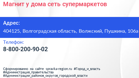 Магнит у дома, сеть супермаркетов по адресу 404125, Волгоградская область, Волжский, Пушкина, 106а в дальнейшем Организация, размещена в следующих категориях: