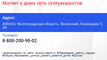 Магнит у дома, сеть супермаркетов по адресу 404143, Волгоградская область, Волжский, Кузнецкая-1, 28 в дальнейшем Организация, размещена в следующих категориях: