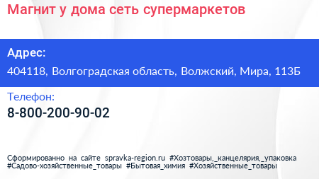Магнит у дома, сеть супермаркетов по адресу 404118, Волгоградская область, Волжский, Мира, 113Б в дальнейшем Организация, размещена в следующих категориях: