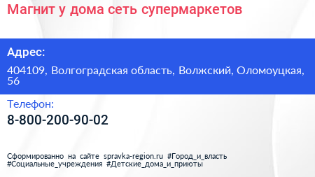 Магнит у дома, сеть супермаркетов по адресу 404109, Волгоградская область, Волжский, Оломоуцкая, 56 в дальнейшем Организация, размещена в следующих категориях: