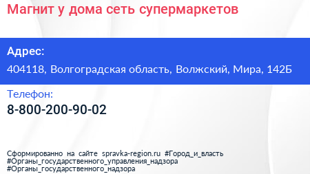 Магнит у дома, сеть супермаркетов по адресу 404118, Волгоградская область, Волжский, Мира, 142Б в дальнейшем Организация, размещена в следующих категориях: