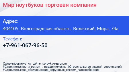Мир ноутбуков, торговая компания по адресу 404105, Волгоградская область, Волжский, Мира, 74а в дальнейшем Организация, размещена в следующих категориях: