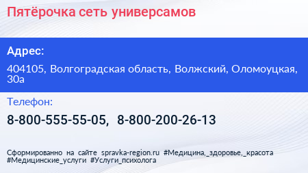 Пятёрочка, сеть универсамов по адресу 404105, Волгоградская область, Волжский, Оломоуцкая, 30а в дальнейшем Организация, размещена в следующих категориях: