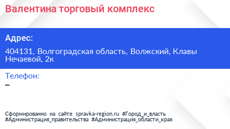 Валентина, торговый комплекс по адресу 404131, Волгоградская область, Волжский, Клавы Нечаевой, 2к в дальнейшем Организация, размещена в следующих категориях: